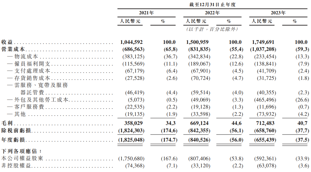 2021年、2022年、2023年,多點(diǎn)數(shù)智實現(xiàn)收益分別為10.45億元、15.02億元、17.5億元;錄得毛利3.6億元、6.69億元、7.13億元;實現(xiàn)毛利率分別為34.3%、44.6%及40.7%。