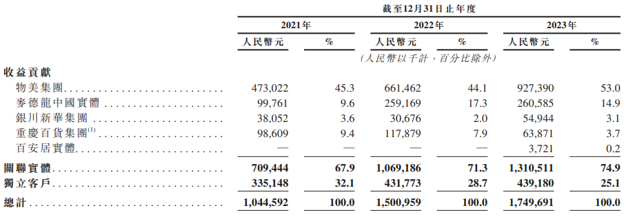 不過,多點(diǎn)數(shù)智七成收益主要是物美集團(tuán)、麥德龍中國實體、重慶百貨集團(tuán)、銀川新華集團(tuán)及百安居實體等公司關(guān)聯(lián)方帶來的。招股書顯示,2021年、2022年及2023年,多點(diǎn)數(shù)智五大客戶產(chǎn)生的收益分別占同年總收益的70.2%、76.6%及81.7%;該期間其關(guān)聯(lián)實體分別貢獻(xiàn)收入比例分別是67.9%、71.3%、74.9%。