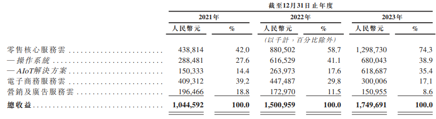 其中,該公司超七成收入來自零售核心服務(wù)云解決方案業(yè)務(wù),于2021年至2023年分別收益4.39億元、8.81億元、12.99億元,占公司總收益比例分別為42%、58.7%及74.3%。另有近兩成收益來自其電子商務(wù)服務(wù)云解決方案業(yè)務(wù),收益分別為5.09億元、4.48億元、3億元,分別占同年總收益的39.2%、29.8%及17.1%。