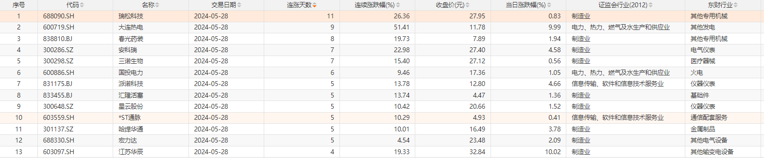 5月28日消息,Choice數(shù)據(jù)統(tǒng)計(jì),A股今日1只個(gè)股連續(xù)11天上漲,為瑞松科技;1只個(gè)股連續(xù)9天上漲,為大連熱電;此外,春光藥裝連續(xù)8天上漲;安科瑞、三諾生物2只個(gè)股連續(xù)7天上漲。