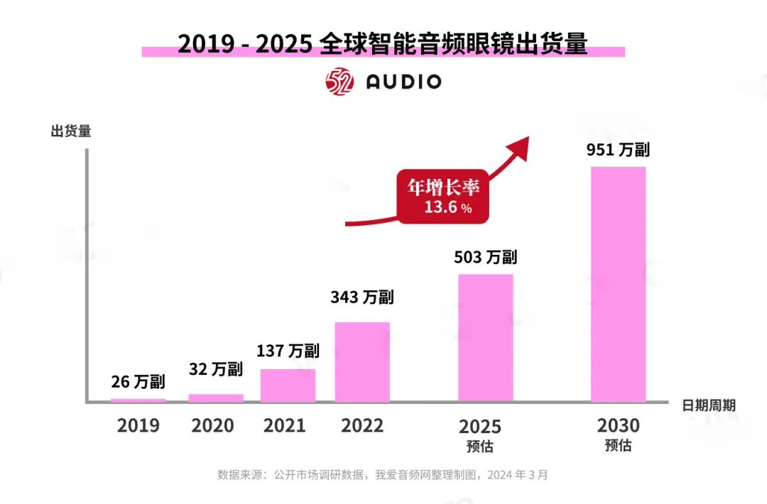 Ray-Ban Meta被稱為AI眼鏡是在其Meta AI功能上線后的事情,而在這之前大家稱它為智能眼鏡或是智能音頻眼鏡。據(jù)公開市場調研數(shù)據(jù),2022 年,全球智能音頻眼鏡市場出貨量達343萬副,公開市場調研數(shù)據(jù)預測,預計到2025年,全球音頻眼鏡市場出貨量將超過 503萬副,2030年將達951萬副。