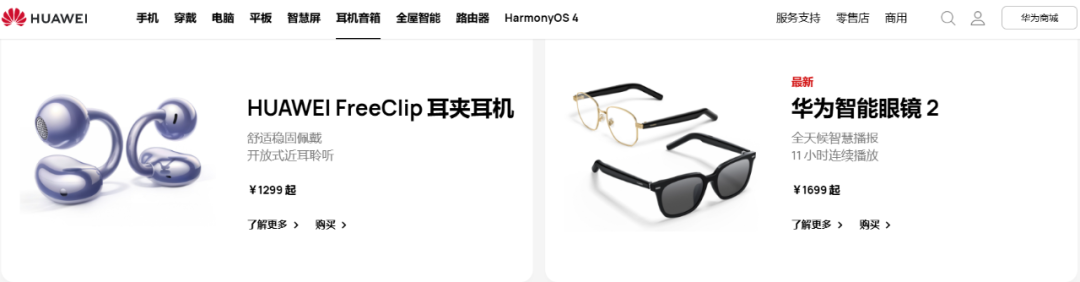 5 月 15 日,華為智能眼鏡 2 方框太陽鏡正式亮相,售價 2299 元。該產(chǎn)品搭載了華為 HarmonyOS 4 操作系統(tǒng),并且已經(jīng)接入華為盤古 AI 大模型,用戶可與小藝展開自然流暢的對話與智慧交互。不過,在華為官網(wǎng)的產(chǎn)品分類中,這款產(chǎn)品被歸為“耳機音箱”類,可見即使搭載了AI功能,也難以逃脫固化的產(chǎn)品屬性。