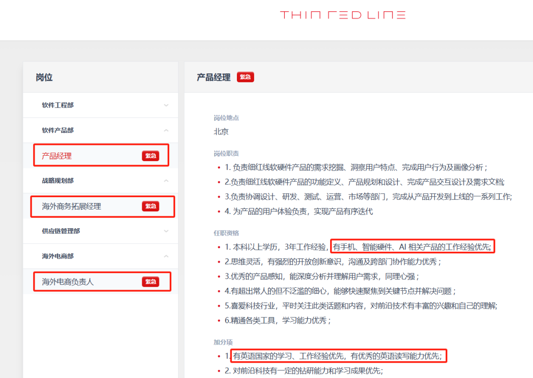 另外在羅永浩的XR公司細紅線招聘頁面顯示,緊急招聘服務端研發(fā)工程師、AI研發(fā)工程師、Android框架工程師、產(chǎn)品經(jīng)理。其中產(chǎn)品經(jīng)理的職位要求為有手機、智能硬件、AI 相關產(chǎn)品的工作經(jīng)驗優(yōu)先,而在戰(zhàn)略規(guī)劃部和海外電商部的職位同樣標為緊急招聘。或許,羅永浩的AI眼鏡將會主要針對海外市場,抑或是放眼全球市場來實現(xiàn)首個產(chǎn)品的開門紅。