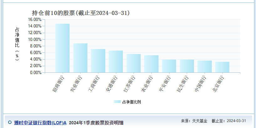 其中,招商中證銀行AH價格優(yōu)選ETF發(fā)起式聯(lián)接A,今年以來漲幅22.55%。博時中證銀行指數(shù)(LOF)A,規(guī)模5.21億,今年以來上漲19.93%,前10重倉股占比62.28%,持倉第一的招商銀行占比高達14.7%。