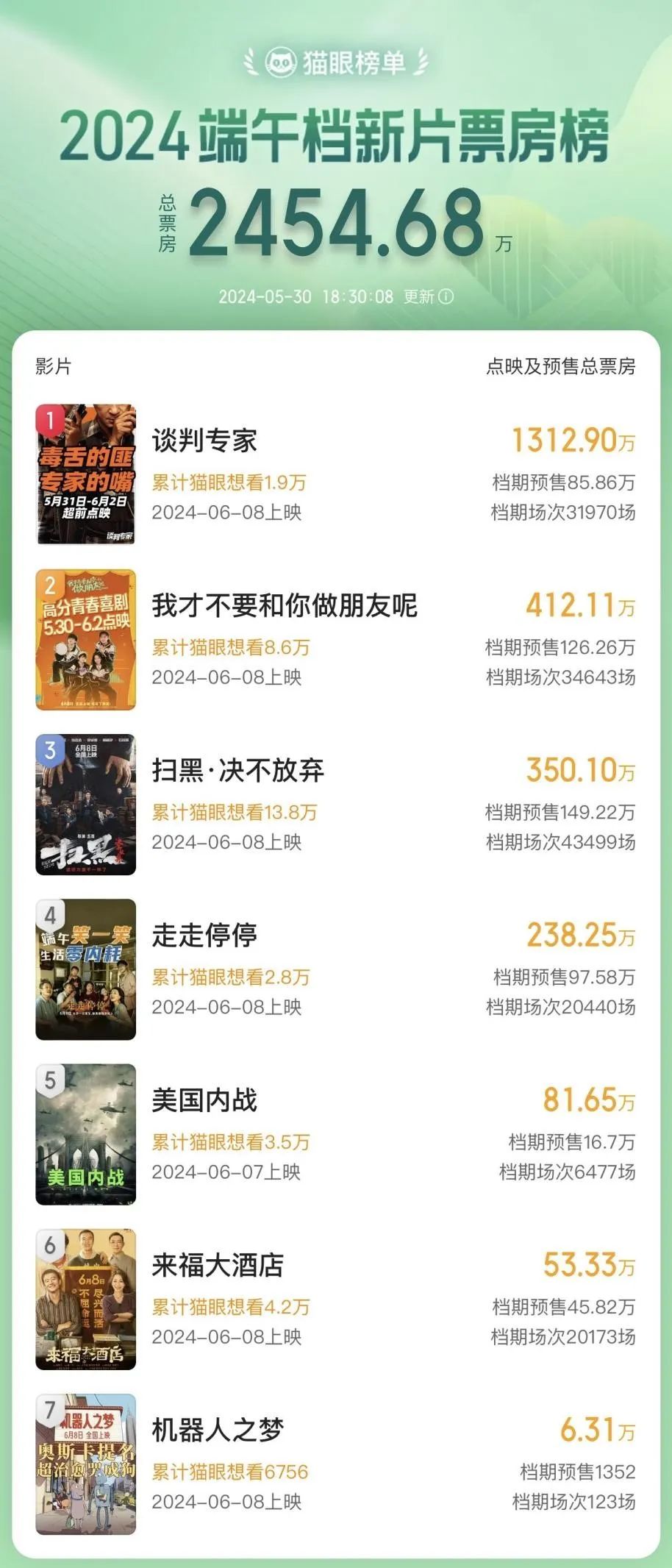 據(jù)貓眼專業(yè)版實時數(shù)據(jù),截至5月30日18時30分,端午檔新片預(yù)售總票房逼近2500萬元(含點映及預(yù)售)。