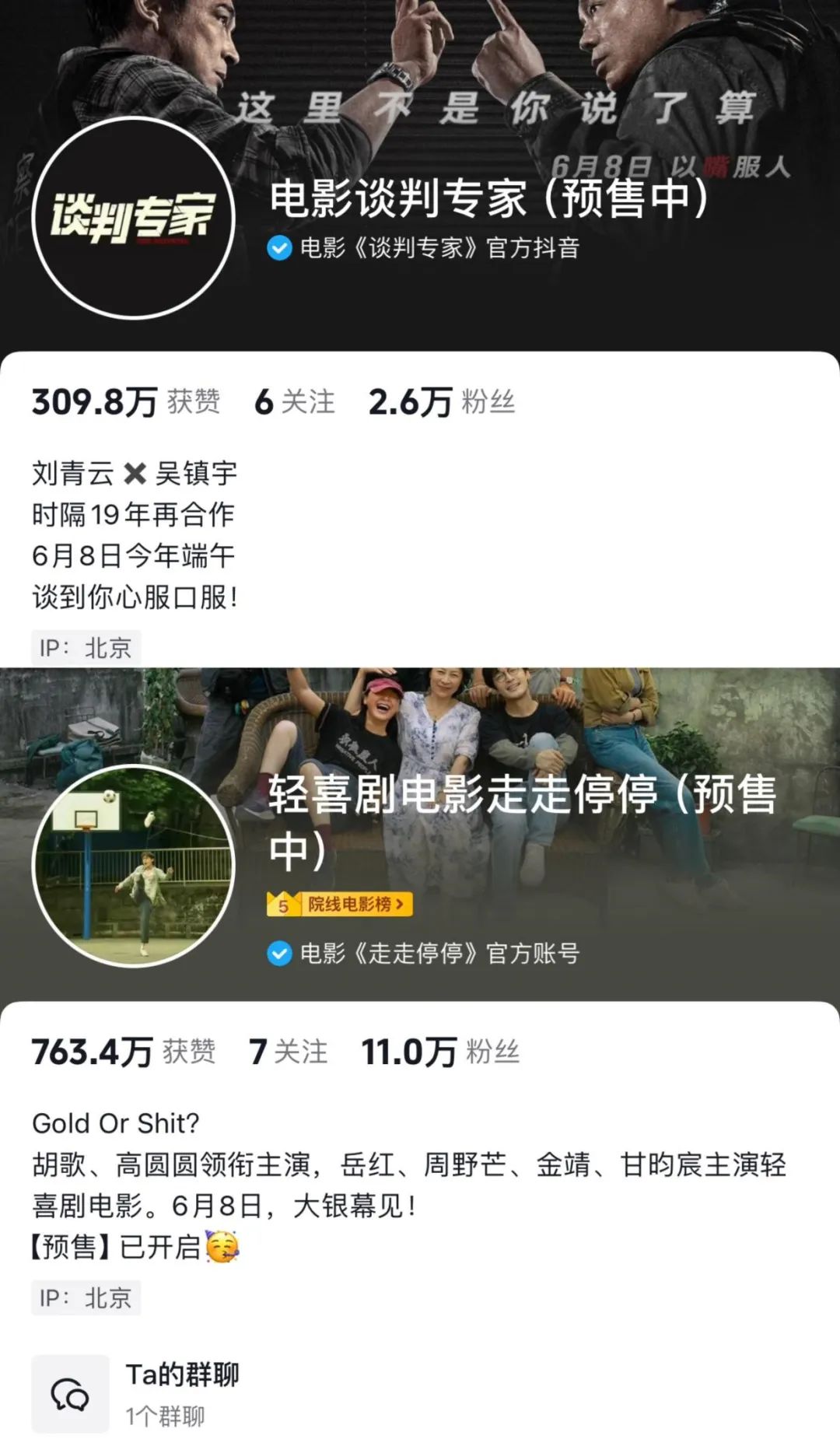 值得注意的是,《談判專家》《走走停停》都將“預(yù)售中”放到了各自的官抖賬號名里。而這背后,既反映了觀眾對端午檔的關(guān)注度有待提升,也再次強調(diào)了一個非常現(xiàn)實的情況,即伴隨著觀眾的娛樂消費選擇日益豐富,電影召回觀眾需要投入時間與精力,成本也將提升。