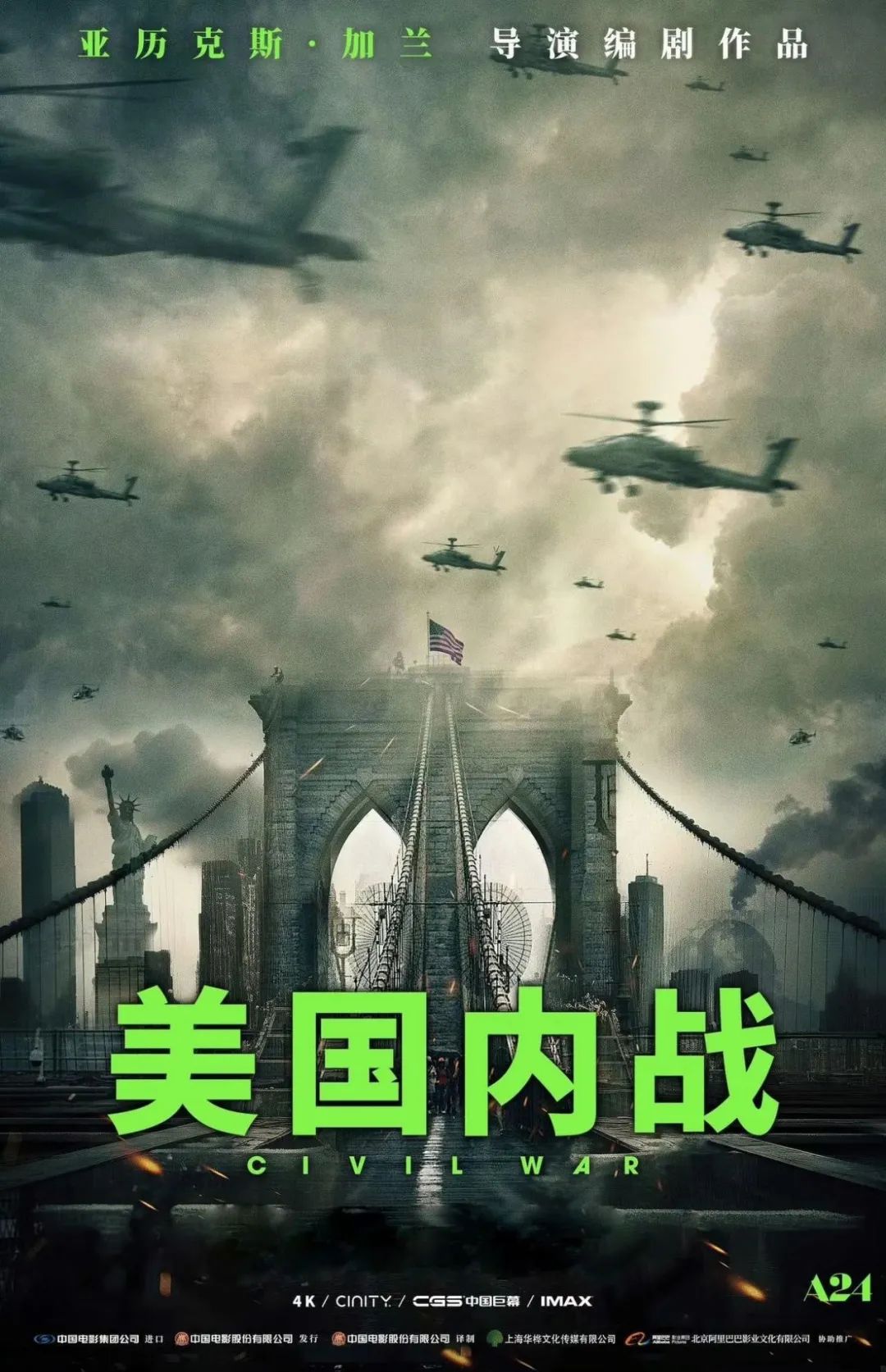 影片由亞歷克斯·加蘭(《湮滅》《機械姬》)編劇、導(dǎo)演,虛構(gòu)了一個“在不久的將來美國爆發(fā)內(nèi)戰(zhàn),一隊記者穿越戰(zhàn)線并設(shè)法生存下來”的故事。在海外一經(jīng)上映,收獲全球超1億美元票房,以及爛番茄開分93%的高口碑認證。