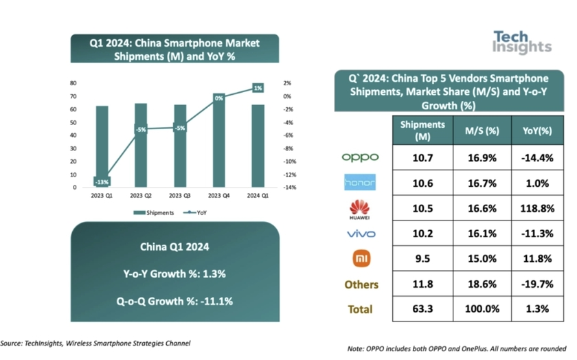 市場調(diào)研機構(gòu)TechInsights發(fā)布的數(shù)據(jù)顯示,2024年一季度,中國智能手機出貨量為6330萬臺,同比增長1%,結(jié)束了連續(xù)11個季度的下滑。