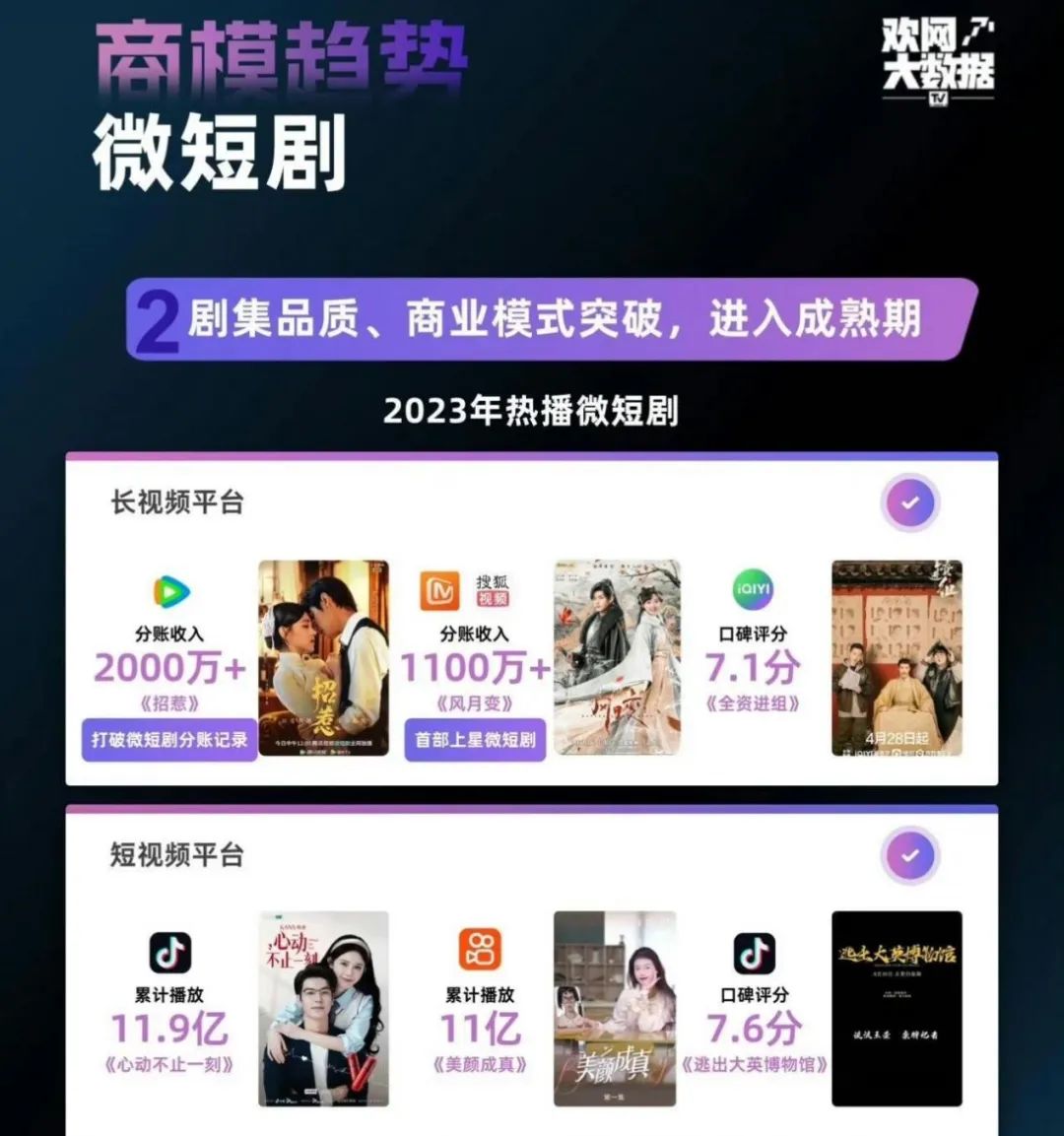 《2023微短劇行業(yè)報(bào)告》顯示,2022年10月1日—2023年8月31日,長視頻平臺上的微短劇分賬金額已超過2.03億,超越2020-2022年9月近三年分賬金額的總和。