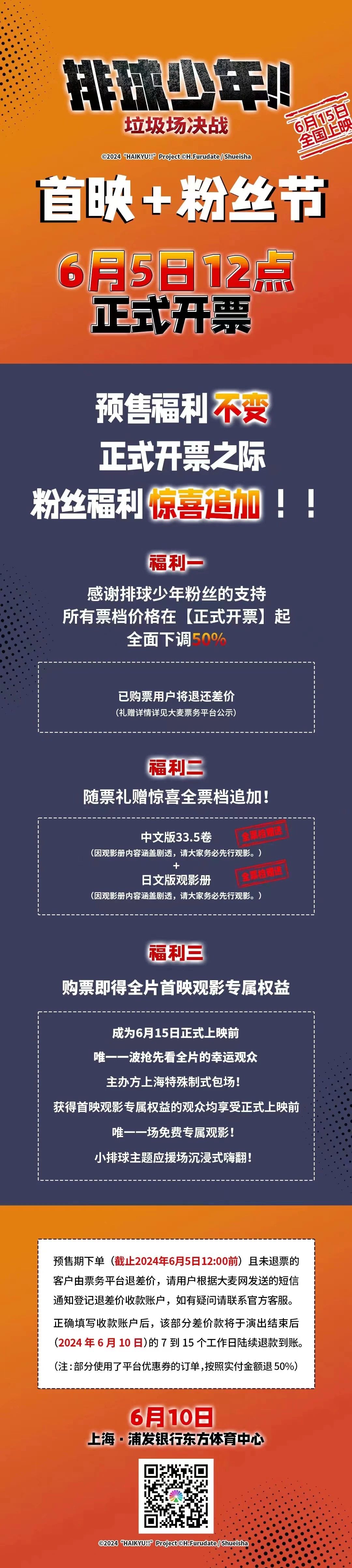 這尷尬的售票狀況,和《排球少年!》在國(guó)內(nèi)的熱度顯然是不匹配的?;顒?dòng)方不得不進(jìn)行補(bǔ)救,不僅刪除了官博上宣傳限定禮包細(xì)節(jié)的微博,并在大麥網(wǎng)的銷售頁(yè)面宣布6月5日直接把全場(chǎng)票價(jià)打5折進(jìn)行重新售賣(之前全價(jià)購(gòu)票者退差價(jià)),把粉絲期望的活動(dòng)流程細(xì)節(jié)寫得清清楚楚,同時(shí)還加贈(zèng)了33.5卷特典觀影手冊(cè),以及活動(dòng)當(dāng)天的超前點(diǎn)映院線包場(chǎng)觀看影片特權(quán)。