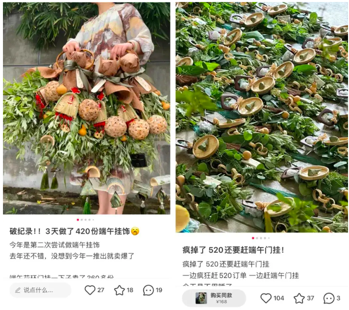 有店主表示,這一波熱度主要源于社交電商上的博主“種草”,高顏值的新式門掛成了過節(jié)曬圖的社交貨幣,店里艾草花束訂單80%來自線上。