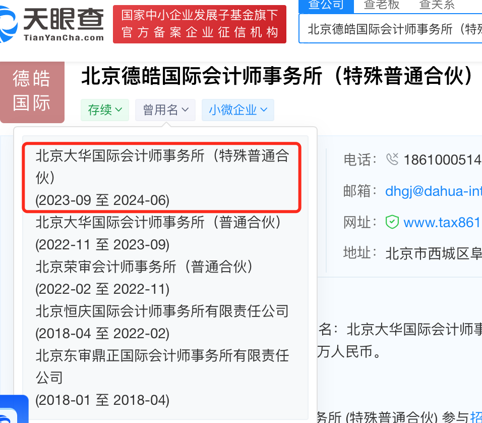 根據(jù)天眼查,如今的北京大華國(guó)際更名為北京德皓國(guó)際會(huì)計(jì)師事務(wù)所(特殊普通合伙),曾用名北京大華國(guó)際顯示使用時(shí)段為2023年9月至2024年6月。