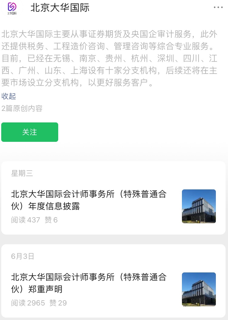除此外,界面新聞注意到,在大華所事件發(fā)酵后,最近又有新的動(dòng)態(tài)。此前界面新聞梳理了相關(guān)情況,其中提及的北京大華國(guó)際會(huì)計(jì)師事務(wù)所(特殊普通合伙)(下稱北京大華國(guó)際),近日似出現(xiàn)更名的動(dòng)作。