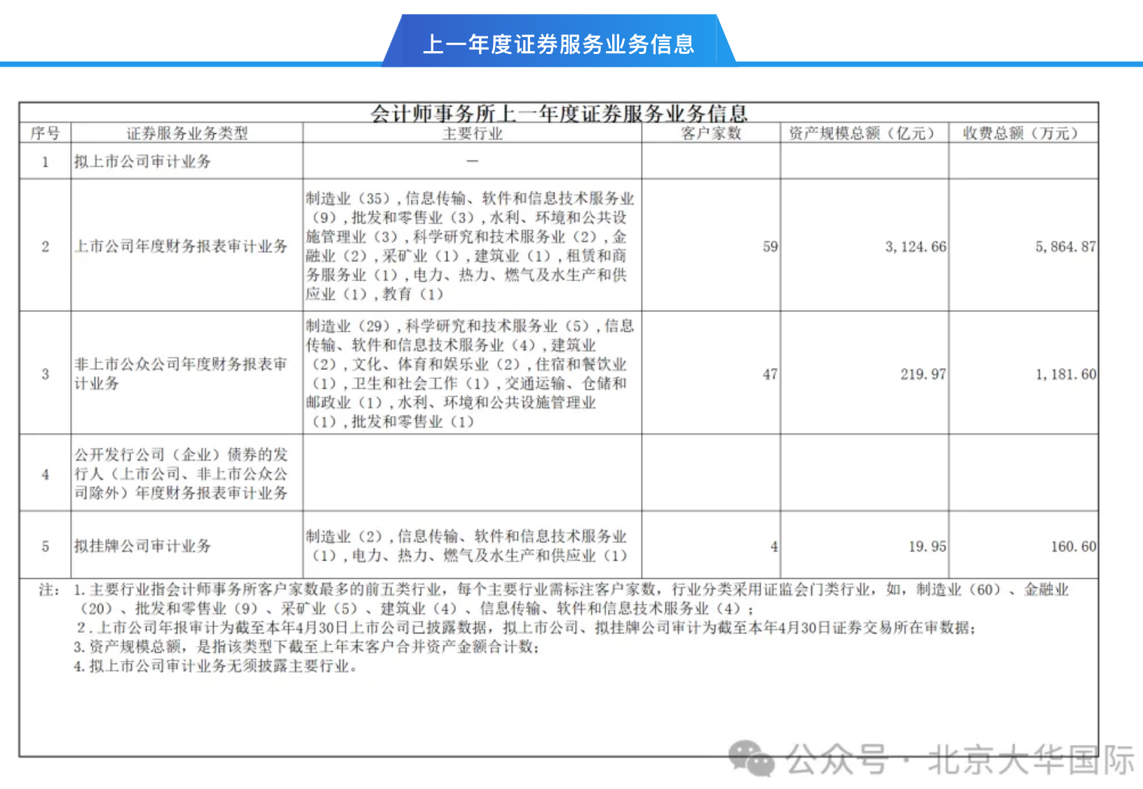 另外根據(jù)6月5日北京大華國(guó)際發(fā)布的“年度信息披露”,事務(wù)所上一年上市公司年度財(cái)務(wù)報(bào)表審計(jì)業(yè)務(wù)客戶家數(shù)59家,收費(fèi)總額5864.87萬(wàn)元;非上市公眾公司年度財(cái)務(wù)報(bào)表審計(jì)業(yè)務(wù)客戶家數(shù)47家,收費(fèi)總額1181.6萬(wàn)元;擬掛牌公司審計(jì)業(yè)務(wù)客戶家數(shù)4家,收費(fèi)總額160.6萬(wàn)元。