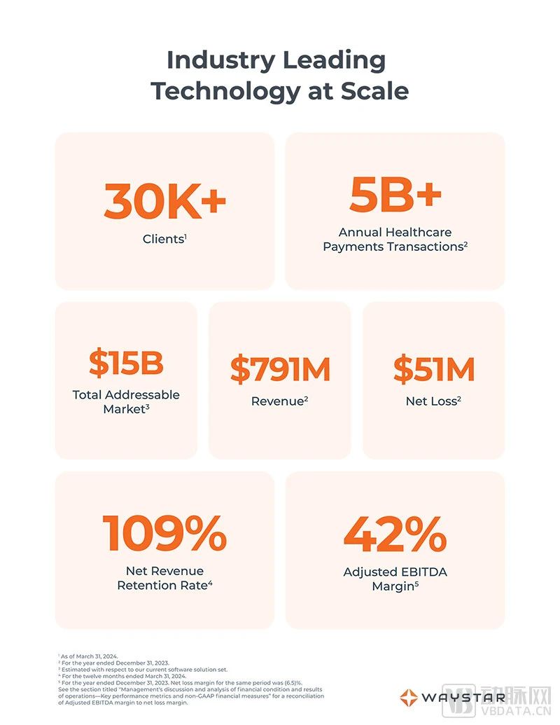 在整個2023年,Waystar共促成了超過50億筆醫(yī)療支付,其中包括超過1.2萬億美元的總報銷,覆蓋了全美約50%的患者。其規(guī)模還是相當可觀的。