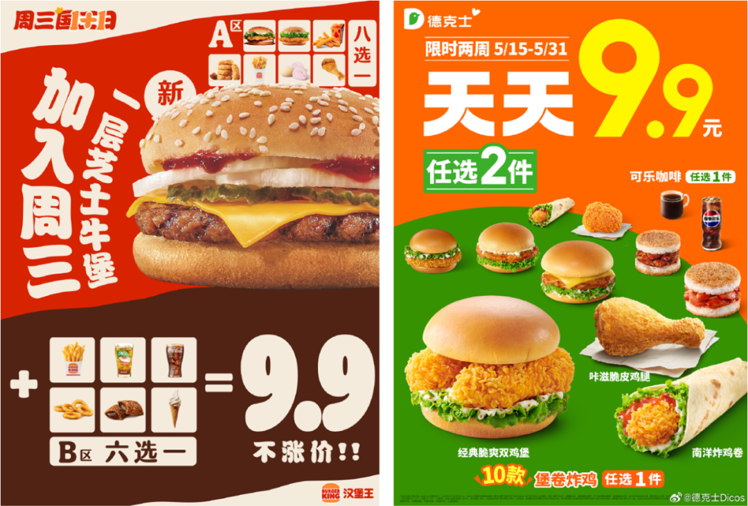 洋快餐里,當(dāng)然不止肯德基、麥當(dāng)勞下場開“卷”。5月中旬起,德克士也發(fā)起了持續(xù)半個(gè)月的“天天9塊9”活動,可選漢堡與飲品兩兩隨機(jī)搭配。而更早之前,也就是去年夏季,漢堡王已經(jīng)上線了“周三國王日”活動,9塊9可選漢堡與小食/飲品的隨心配。