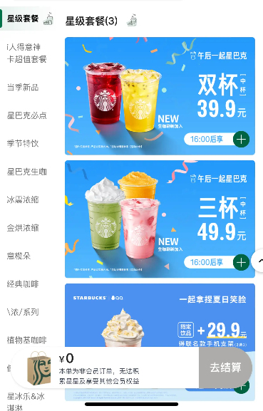 從單價(jià)三四十元一杯到9.9元一杯,對于星巴克來說,一下子放低身段至此還是有點(diǎn)難,也因此,需要疊加餓了么等平臺的各種羊毛優(yōu)惠才能做到如此低價(jià),但如今,普通用戶的星巴克小程序內(nèi),確實(shí)會被不間斷投喂大量39.9元兩杯、49.9元三杯的任選優(yōu)惠券。