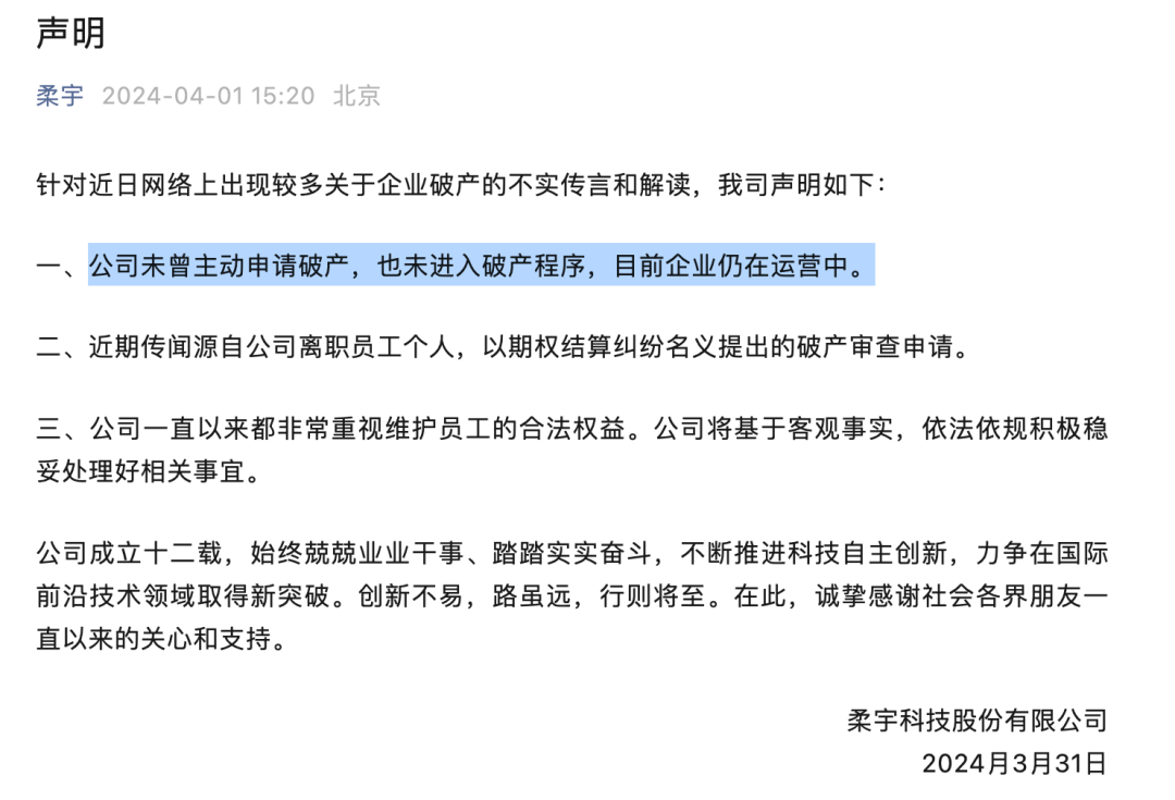 4月1日,官微久未更新的柔宇科技發(fā)布了今年的第一條推送,對公司的“破產(chǎn)傳言”進行聲明,表示公司未曾主動申請破產(chǎn),也未進入破產(chǎn)程序,目前企業(yè)仍在運營中。