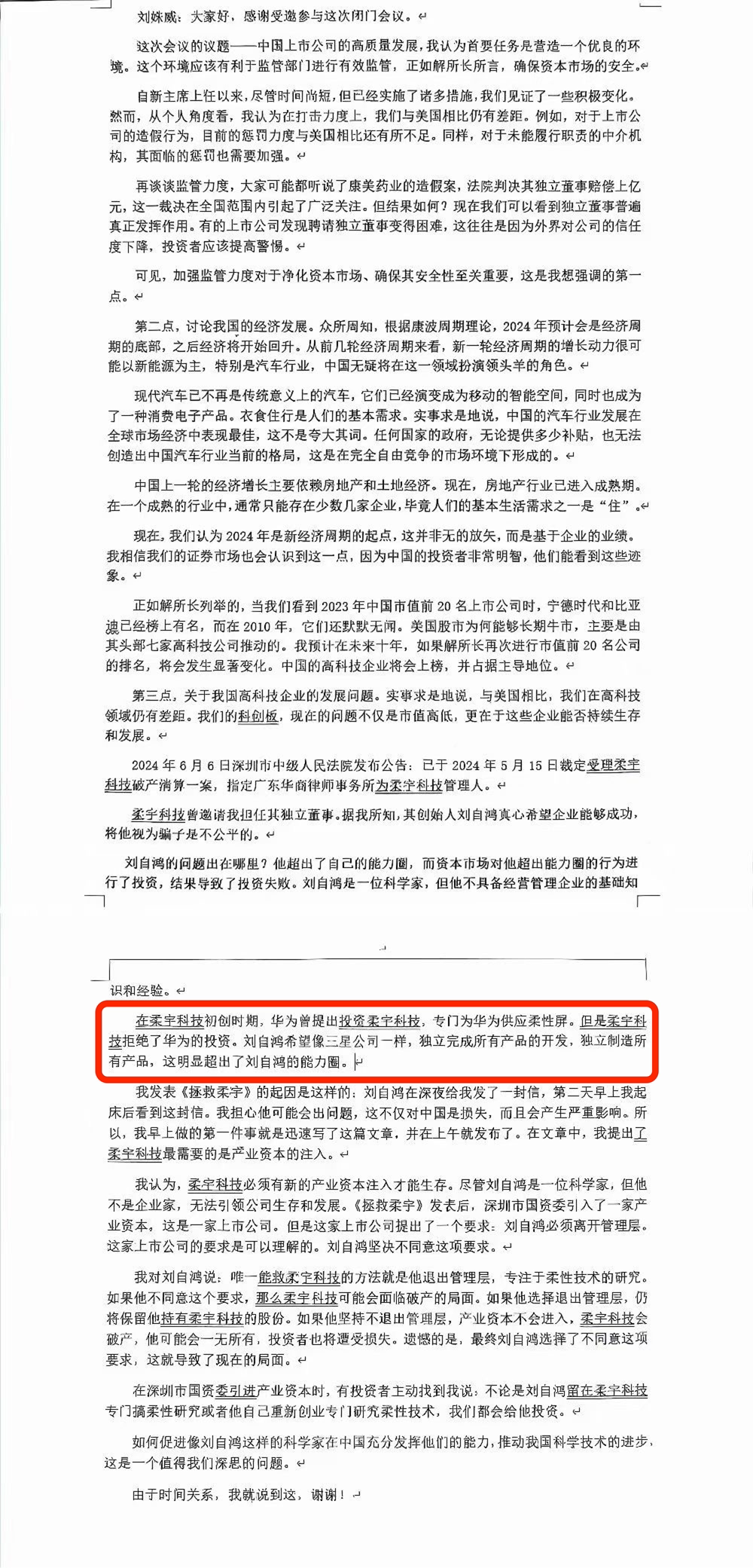 6月9日深夜,中央財經(jīng)大學(xué)中國企業(yè)研究中心主任、知名財經(jīng)學(xué)者劉姝威在朋友圈,貼出了其在“中國上市公司的高質(zhì)量發(fā)展”的閉門會議上的發(fā)言摘要,主要內(nèi)容為反思柔宇科技破產(chǎn)一事。其中提到在初創(chuàng)期,柔宇科技曾拒絕了華為的投資。