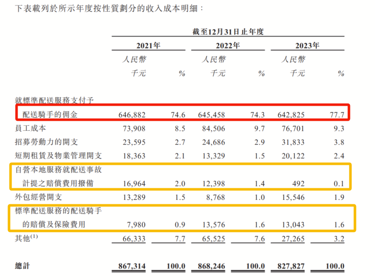 報告期內(nèi),博爾捷的收入成本分別為8.67億元、8.68億元和8.28億元。這些成本包括了從騎手傭金到事故賠償準備金等一系列費用。其中,支付給騎手的傭金是成本的主要部分,連續(xù)三年占比超過70%,累計支付額高達19.35億元。