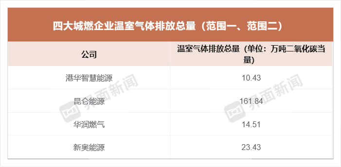 溫室氣體總排放強(qiáng)度方面,港華智慧能源為0.062噸二氧化碳當(dāng)量/萬元,華潤(rùn)燃?xì)鉃?.0168噸二氧化碳當(dāng)量/萬元,新奧能源為0.021噸二氧化碳當(dāng)量/萬元,昆侖能源為0.328噸二氧化碳當(dāng)量/萬立方米。