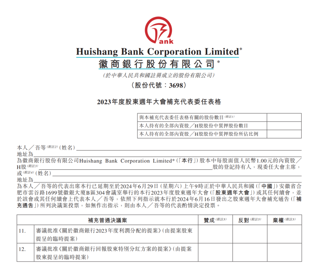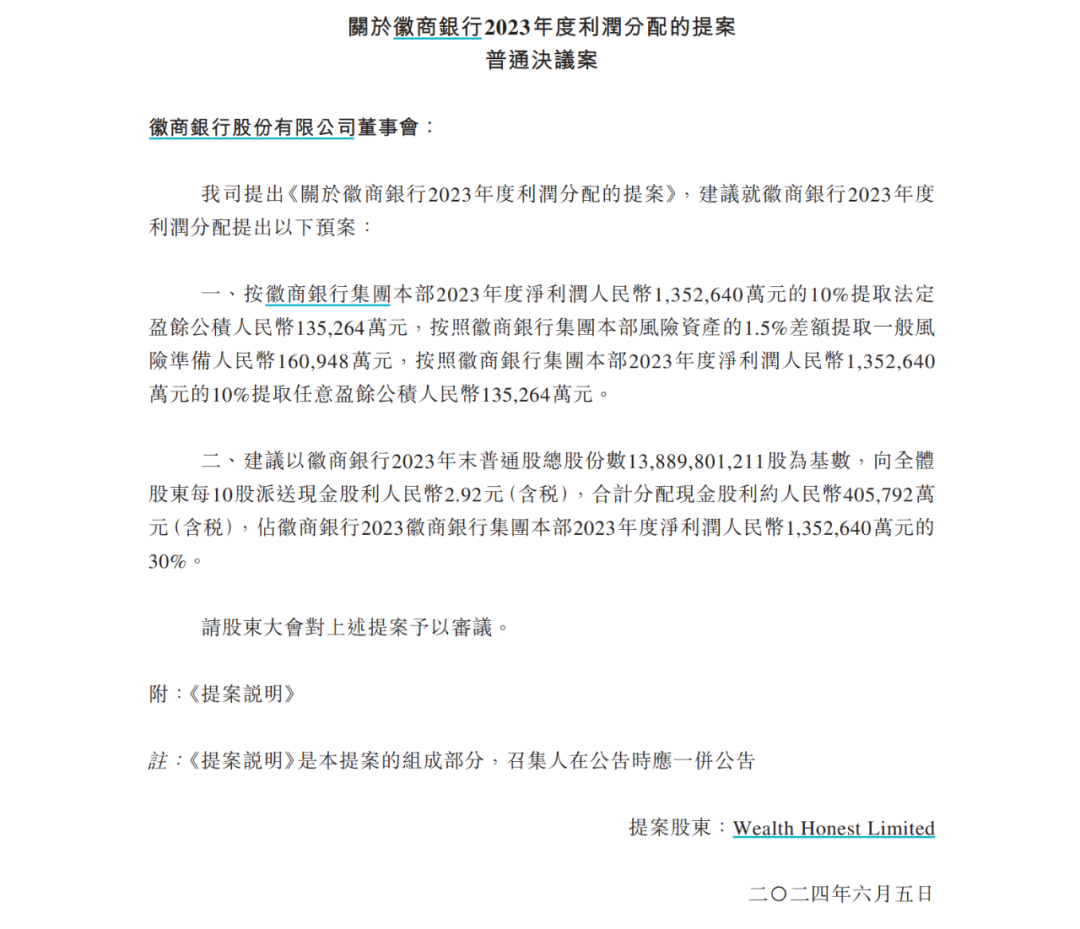 Wealth Honest Limited共提交了兩份臨時提案。其中一份《第11項補充普通決議案》建議截至2023年度分紅,按照每10股2.92元進行。該方案合計分配現金股利約40.58億元(含稅),占2023年徽商銀行集團本部凈利潤135.26元的30%。