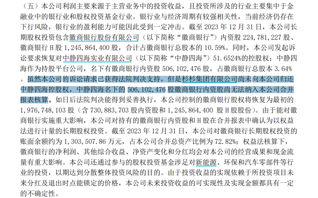 但據中靜新華資管2023年債券年報顯示,該公司起訴要求恢復中靜四海51.65%的控股權。雖然該公司訴訟請求已獲得法院判決支持,但是杉杉集團尚未歸還中靜四??毓蓹?。