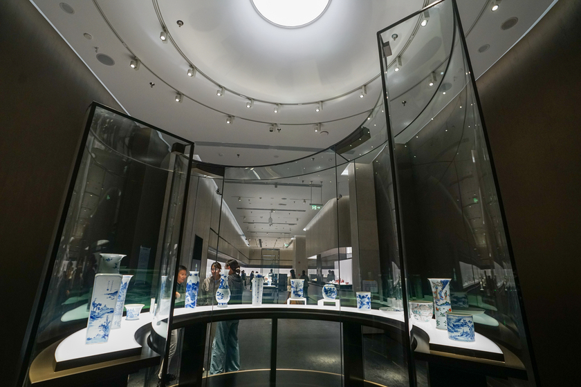 聚焦城市文脈探源和對外文化交流主題,上博東館還新推出了兩個專題展廳,分別是考古館“考古上?!闭购吞沾蓪n}館“China·世界:陶瓷與中外交流”展。陶瓷專題館是上海博物館全新策劃推出的常設專題陳列,旨在書寫一部濃縮的貿(mào)易陶瓷史教科書,同時也是海內(nèi)外首個以陶瓷為媒介,展現(xiàn)隋唐至明清時期中外經(jīng)濟、政治、文化交流多維面貌的通史陳列。展覽精選353件/組展品,其中近半數(shù)首次公開展出,全面展示隋唐、宋元至明清時期中國貿(mào)易陶瓷(外銷瓷)的歷史變遷,幾乎是代表性品種的一次完整呈現(xiàn)。褚曉波笑稱“后悔這個館開晚了”——2024年上海高考歷史卷中,有22分的考題內(nèi)容與陶瓷專題館的展覽密切相關。他建議參加中考、高考的考生經(jīng)常來上博看看,或許會對歷史有更深入的理解。