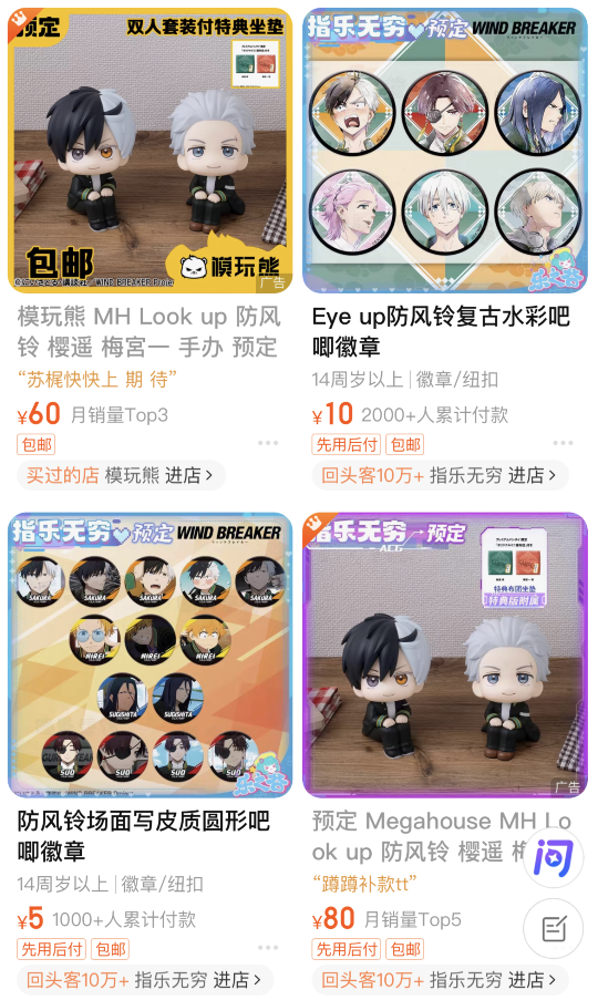 單看國內評分,似乎作品平平無奇,愛好者間的討論度也無法與當季少女樂隊相比,但若將評價標準放到衍生品領域,該作的谷圈卻隱隱有燙起來的趨勢。國內二手平臺,《防風鈴》熱門角色的吧唧價格漲至三位數,單價超200元的Look up手辦在某寶代購大店進入了“月銷量TOP3”的行列。
