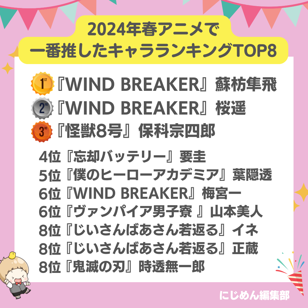 《防風鈴》的優(yōu)劣勢都很突出,這不妨礙它成為連載平臺人氣排行榜??汀赢嫽?,角色與IP影響力進一步擴大,女性向網站nijimen編輯部票選出的2024年【春季動畫最推薦的角色】榜單前八,有3位出自《防風鈴》。