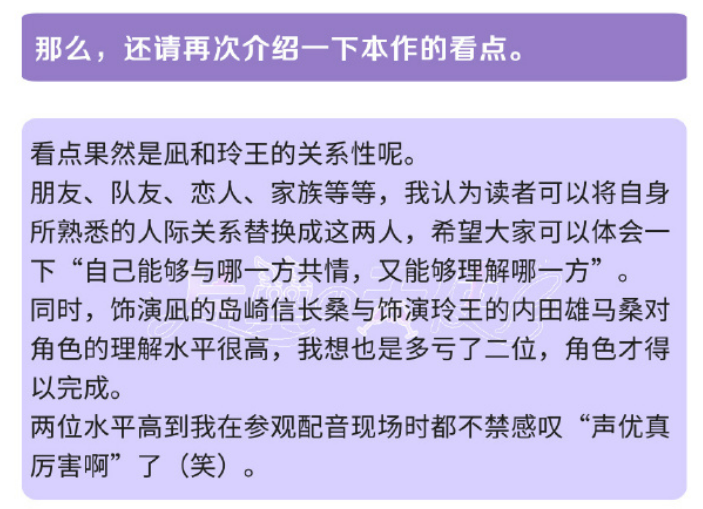 《防風鈴》改編自二位悟創(chuàng)作、講談社App“Magazine Pocket”上連載的同名漫畫,CloverWorks的動畫制作穩(wěn)定發(fā)揮,努力呈現了原作亮點。