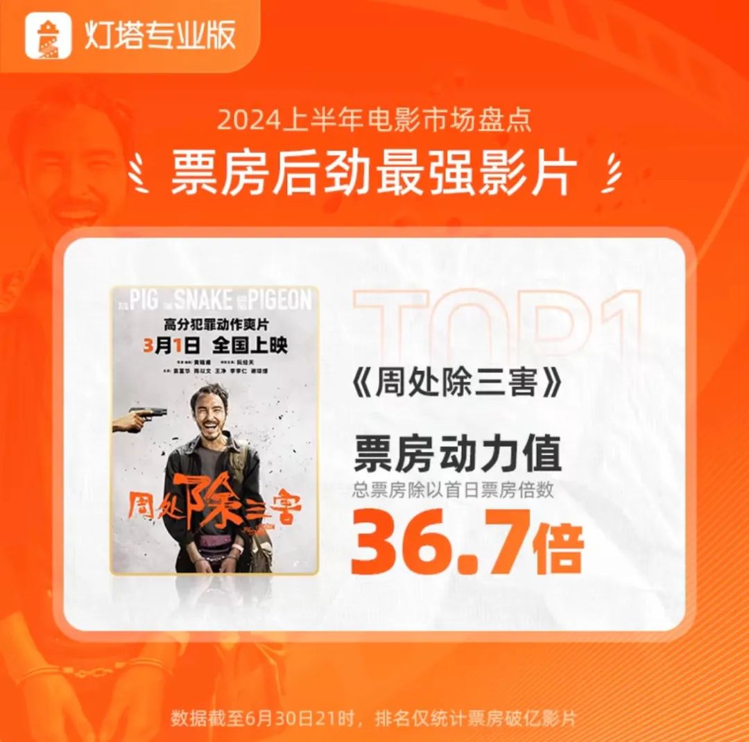 除春節(jié)檔外,只有3月份的單月票房同比實現(xiàn)了小幅上漲,其它月份都不及去年月票房成績,3、4、5、6月票房成績均不到30億水平。3月份的“后春節(jié)檔”能夠達(dá)成上漲趨勢,也是依靠非檔期黑馬《周處除三害》得以救市。這意味著,上半年的檔期并未對電影大盤起到突出的帶動作用。