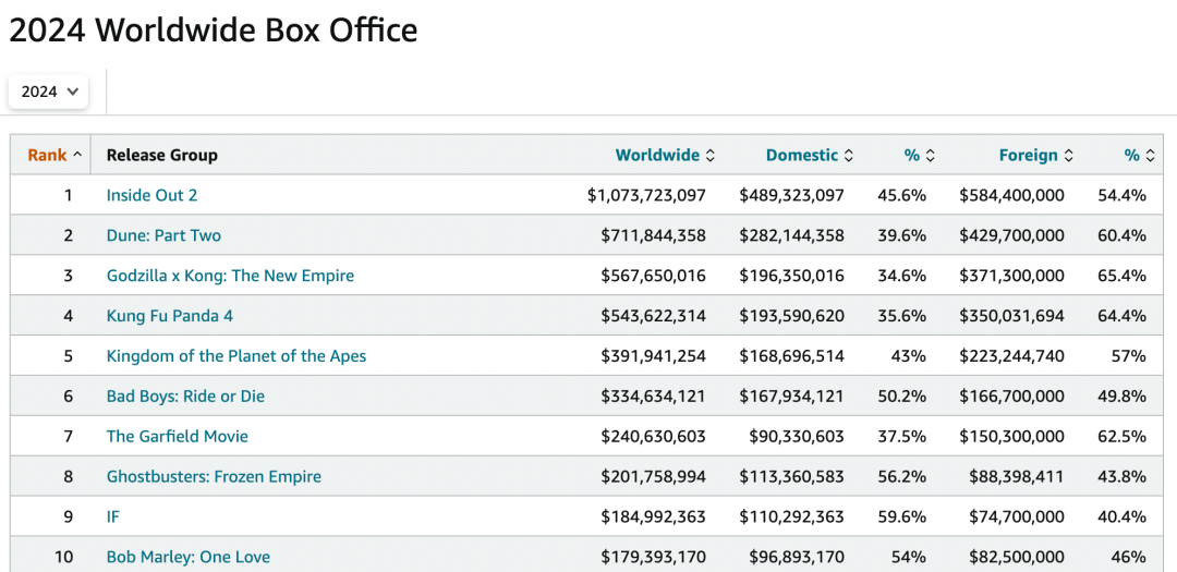 2024上半年全球票房(圖源:Box Office Mojo)