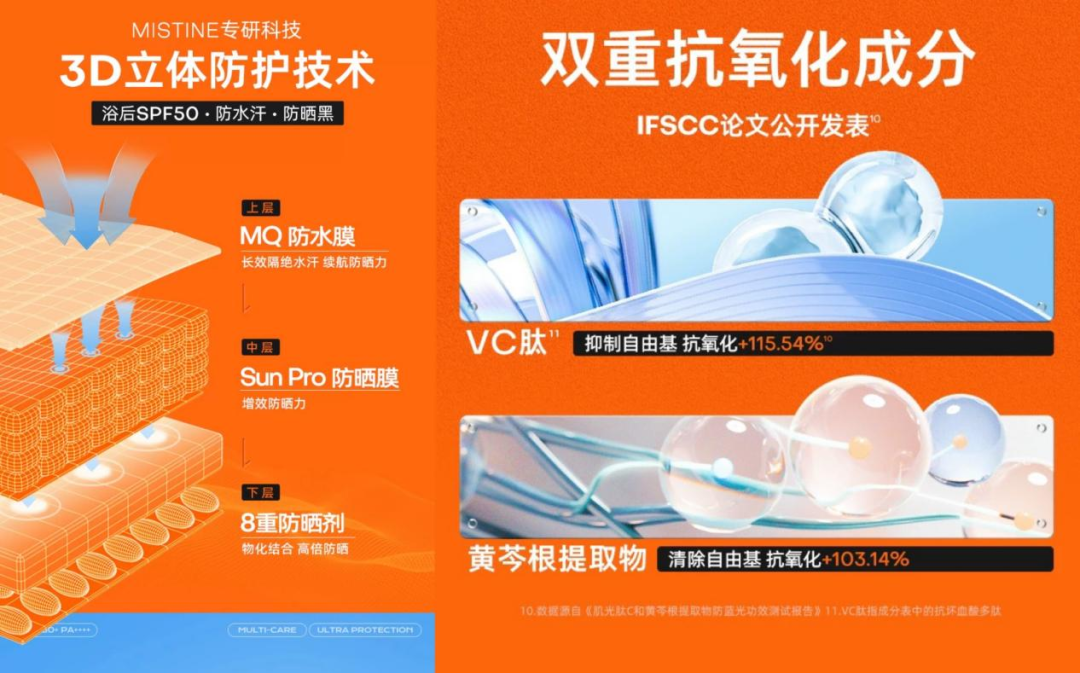 MISTINE蜜絲婷結(jié)合了化學(xué)防曬劑(甲氧基肉桂酸乙基乙酯、丁基甲氧基二苯甲?;淄?、奧克利林)和物理防曬劑(二氧化鈦)的優(yōu)點,提供全面有效防曬保護的同時,添加了雙重抗氧化成分——VC肽和黃苓根提取物,實現(xiàn)曬后肌膚的修護。