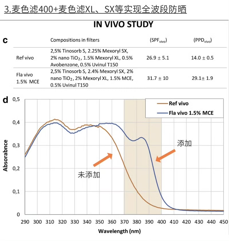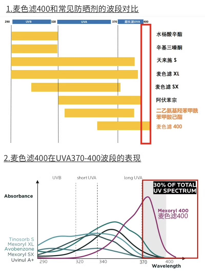 2022年,歐萊雅集團攜手巴斯夫,在防曬領(lǐng)域取得了重大突破,推出了創(chuàng)新的麥色濾400防曬技術(shù)(或稱UVMune 400)。它能有效阻擋380到400納米范圍內(nèi)的超長波UVA,是目前市場上唯一覆蓋UVA400波段的防曬劑。