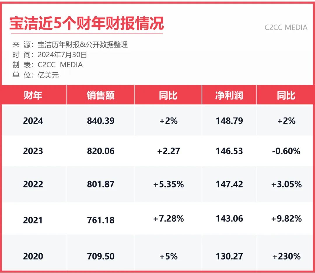 報告顯示,2024財年,寶潔銷售額為840.39億美元(約合人民幣6092億元),較上年增長2%;凈利潤為148.79億美元(約合人民幣1086億元),同比增長2%。