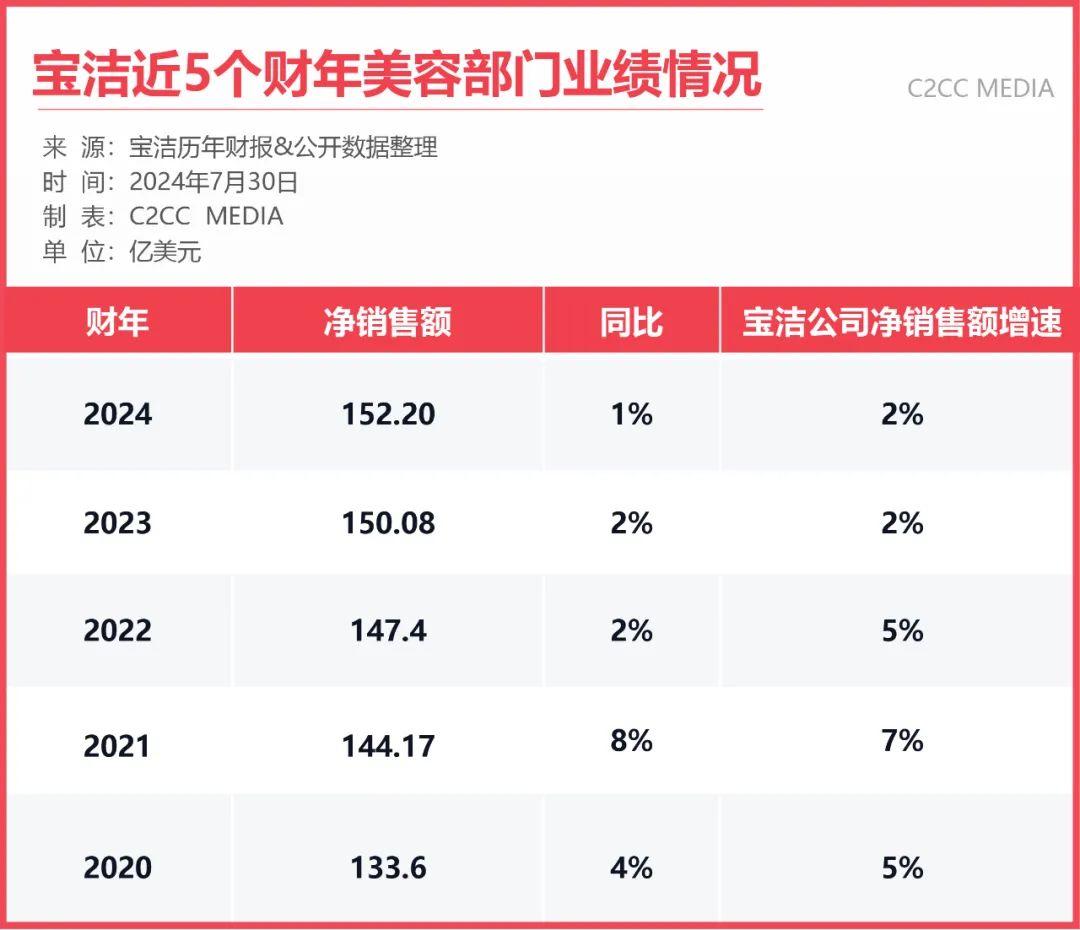 把時間線拉長,C2CC傳媒梳理發(fā)現(xiàn),寶潔美容業(yè)務近5年來僅維持個位數(shù)增長,2022年之前,美容業(yè)務增速尚能跑贏集團增速,但從2022年開始,增速均在集團增速之下或持平。