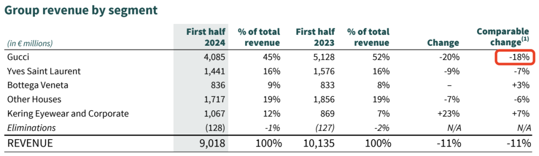 同樣“賣(mài)不動(dòng)”的還有Gucci及其母公司開(kāi)云集團(tuán)。2024年上半年,Gucci收入大跌20%,開(kāi)云集團(tuán)營(yíng)收同比下降11%,歸母凈利潤(rùn)同比下降51%。