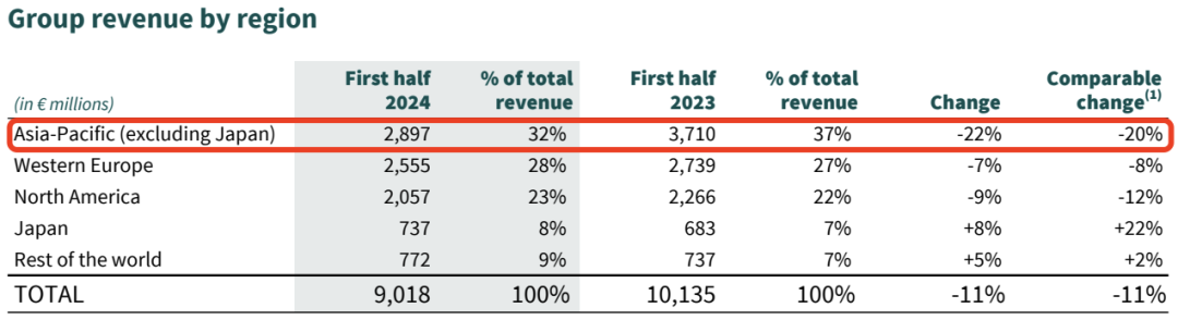 若從地區(qū)來(lái)看,2024年上半年,LVMH集團(tuán)在亞洲市場(chǎng)(不包括日本)的銷(xiāo)售額同比下降了10%,尤其是在第二季度,該地區(qū)銷(xiāo)售額下降了14%。