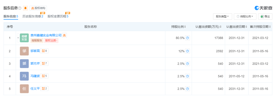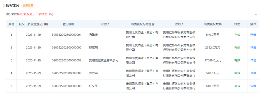 天眼查顯示,2023年11月,貴州嘉健實業(yè)有限公司、馮建波、鄔家高、郭方芹、任義平五方分別向貴州仁懷茅臺農(nóng)村商業(yè)銀行股份有限公司茅臺支行出質(zhì)股權(quán)17388萬元、540萬元、2592萬元、540萬元和540萬元。