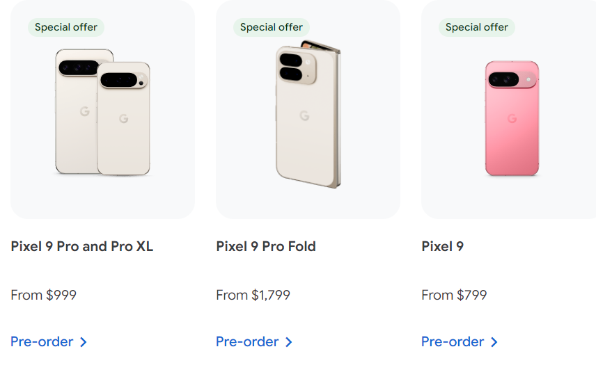 谷歌發(fā)布了四款新手機(jī),分別是Pixel 9、兩種尺寸的Pro機(jī)型Pixel 9 Pro、Pixel 9 Pro XL,以及折疊屏手機(jī)Pixel 9 Pro Fold,售價(jià)分別為799美元、999美元、1799美元起。