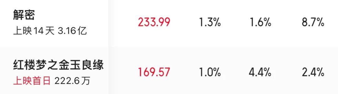 根據(jù)貓眼專業(yè)版數(shù)據(jù)顯示,上映首日,《紅樓夢(mèng)之金玉良緣》僅收169.54萬(wàn)票房,不及已經(jīng)上映了14天的《解密》。對(duì)比網(wǎng)傳的2億成本,該片預(yù)測(cè)最終票房只有760萬(wàn),遠(yuǎn)遠(yuǎn)不到回本線。