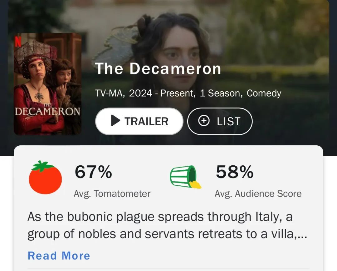 前不久,改編自意大利作家薄伽丘名作《十日談》的《翡冷翠十日談》正式開(kāi)播,播出后,效果不及預(yù)期,爛番茄指數(shù)67%,IMDb6.3分,Metacritic只有65分?!杜f金山紀(jì)事報(bào)》評(píng)價(jià)道,“有很多地方可以做得更好,可是全錯(cuò)了。錯(cuò)得可怕、荒謬、毫無(wú)意義。”