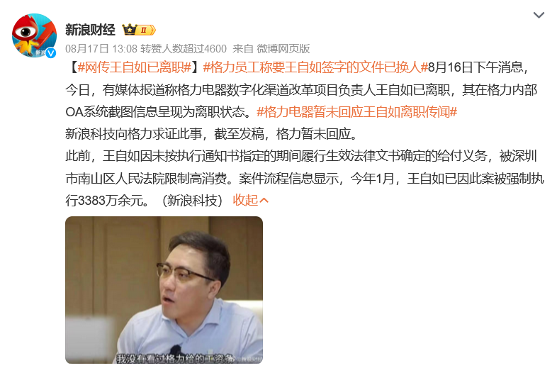8月16日,多名格力員工證實,格力內網(wǎng)系統(tǒng)已搜索不到王自如的對應郵箱。格力OA系統(tǒng)截圖顯示,王自如已為離職狀態(tài),多次嘗試聯(lián)系格力電器和王自如本人,截至發(fā)稿,仍未取得回應。