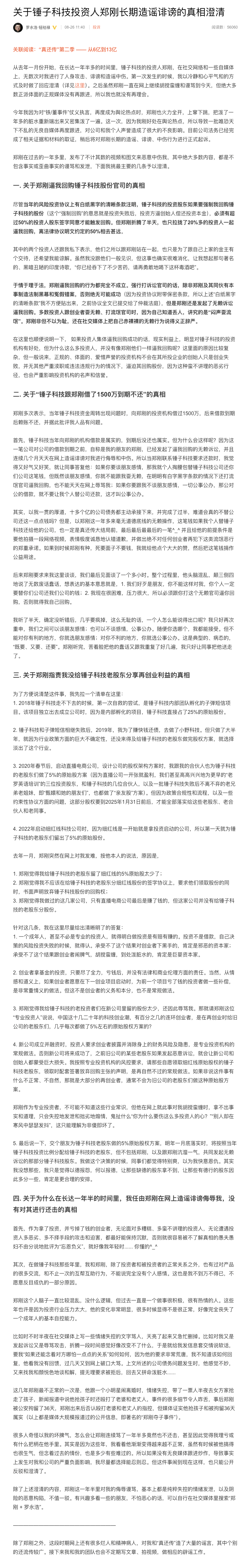 8月26日午間,羅永浩通過其個人微博發(fā)布《關(guān)于錘子科技投資人鄭剛長期造謠誹謗的真相澄清》文章。文章透露,“目前公司法務(wù)已經(jīng)完成了相關(guān)證據(jù)和材料的取證,稍后將對鄭剛長期的造謠、誹謗、中傷行為進行正式起訴?!绷_永浩表示,交個朋友為錘子科技老股東做的5%原始股權(quán)方案,明年一月底落實時,將按照當年錘子科技投資比例分配給錘子科技的老股東,“但不包括鄭剛,以及跟鄭剛沆瀣一氣,共同發(fā)起無賴訴訟的那部分錘子科技股東”。