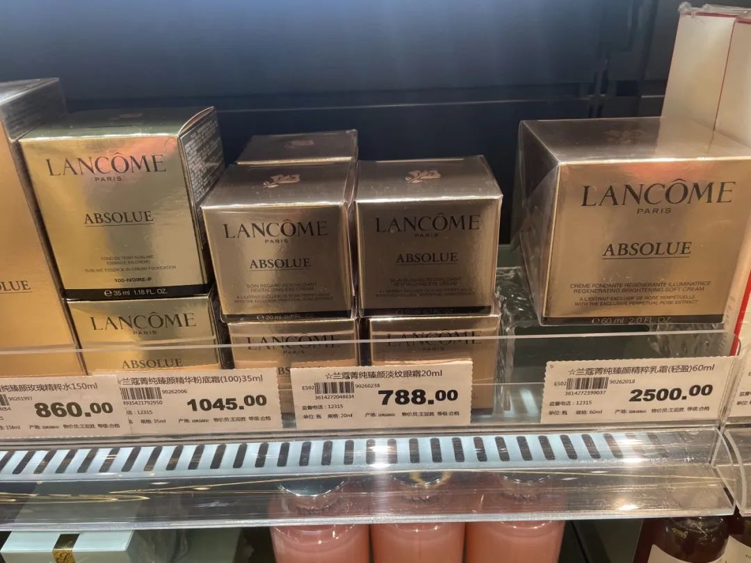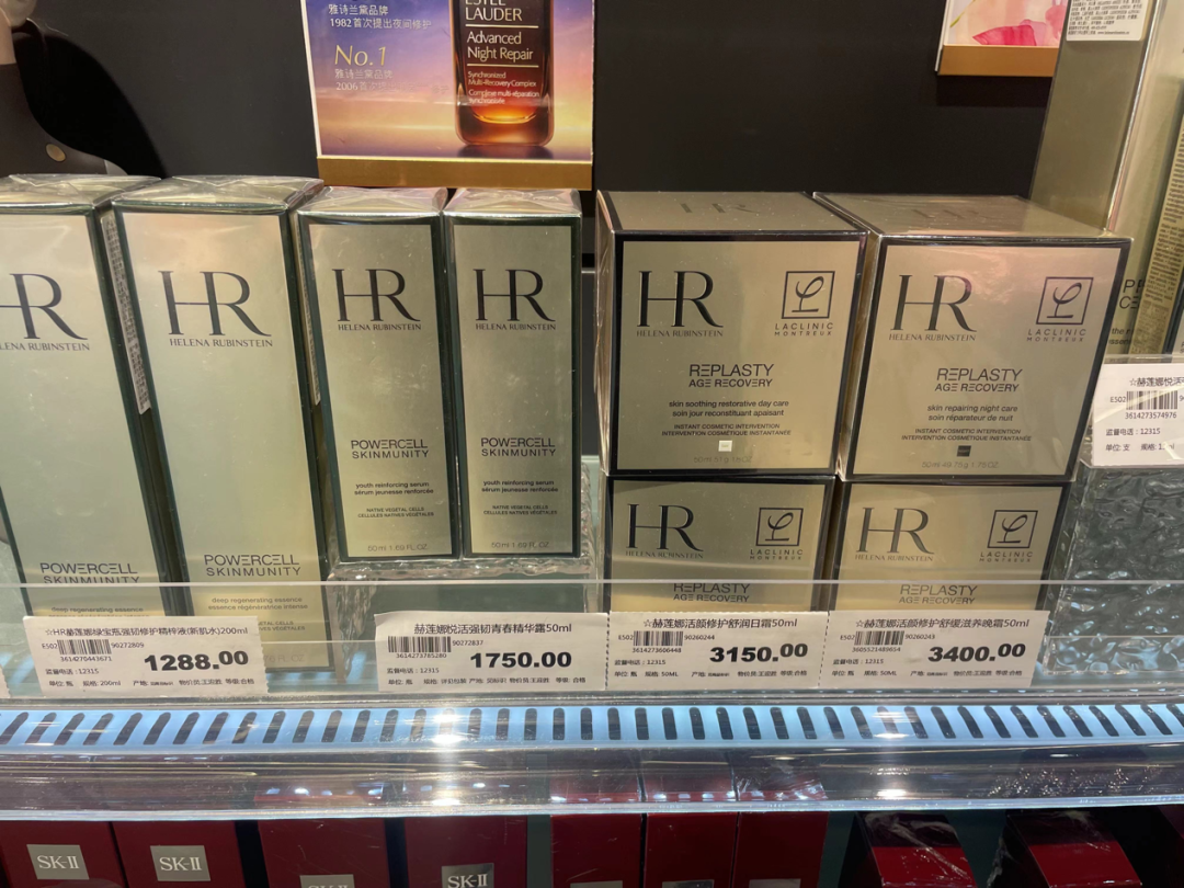 其次,距離入口最近的第一個貨架,即包含了赫蓮娜、海藍之謎、雅詩蘭黛、蘭蔻等高奢品牌與高端品牌。