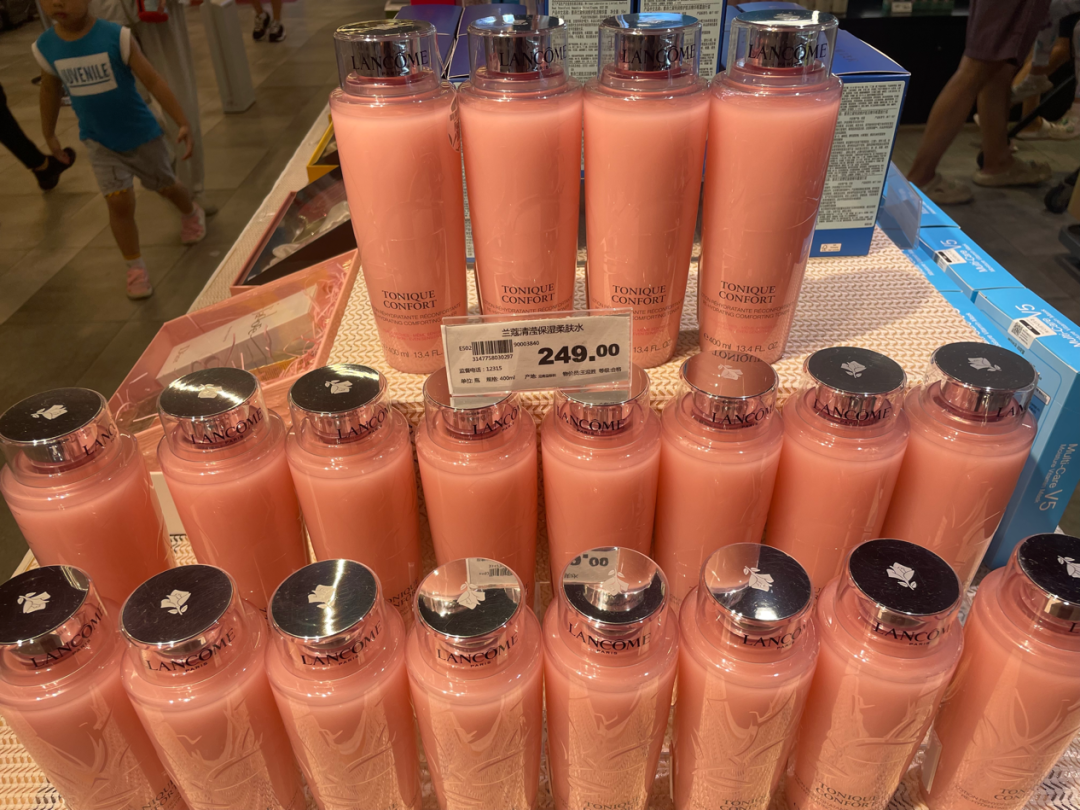 超市一樓收銀員表示,賣得最好的就是蘭蔻大粉水(249元、400ml)。在天貓國際上,這個粉色的瓶裝水售價270元。該收銀員清晰地記得,有位年輕女士一口氣買了5瓶,“用了4張中百購物卡,自己還補了幾百塊錢?!?/p>