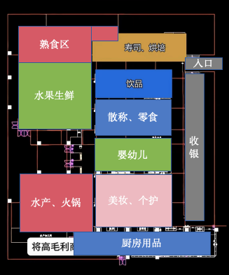 換句話說,排除服裝區(qū)與飲品區(qū),胖東來在追求壽司、烘焙等高毛利商品的曝光率,即追求毛利,中百則在用美妝追求流量。
