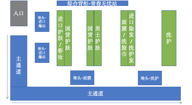 如原來超市主通道寬度在1.8米,現(xiàn)在拓展至3到4米,貨架高度從1.8米降到了1.6米。此外,化妝品區(qū)域堆頭數(shù)縮減至4個?;瘖y品背柜全部取消,僅新設(shè)一個名為“青春無憂站”的美妝個護綜合背柜。