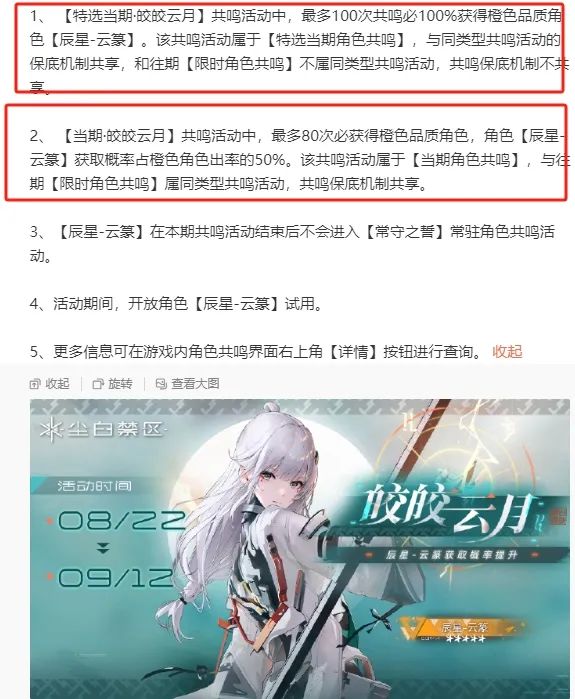 而游戲茶館也觀察到,其他新上線的二游也加大福利投放。如《物華彌新》每個版本都送十連抽,《塵白禁區(qū)》《星之翼》推出必出池,提升游戲性價比,也是一種打折。